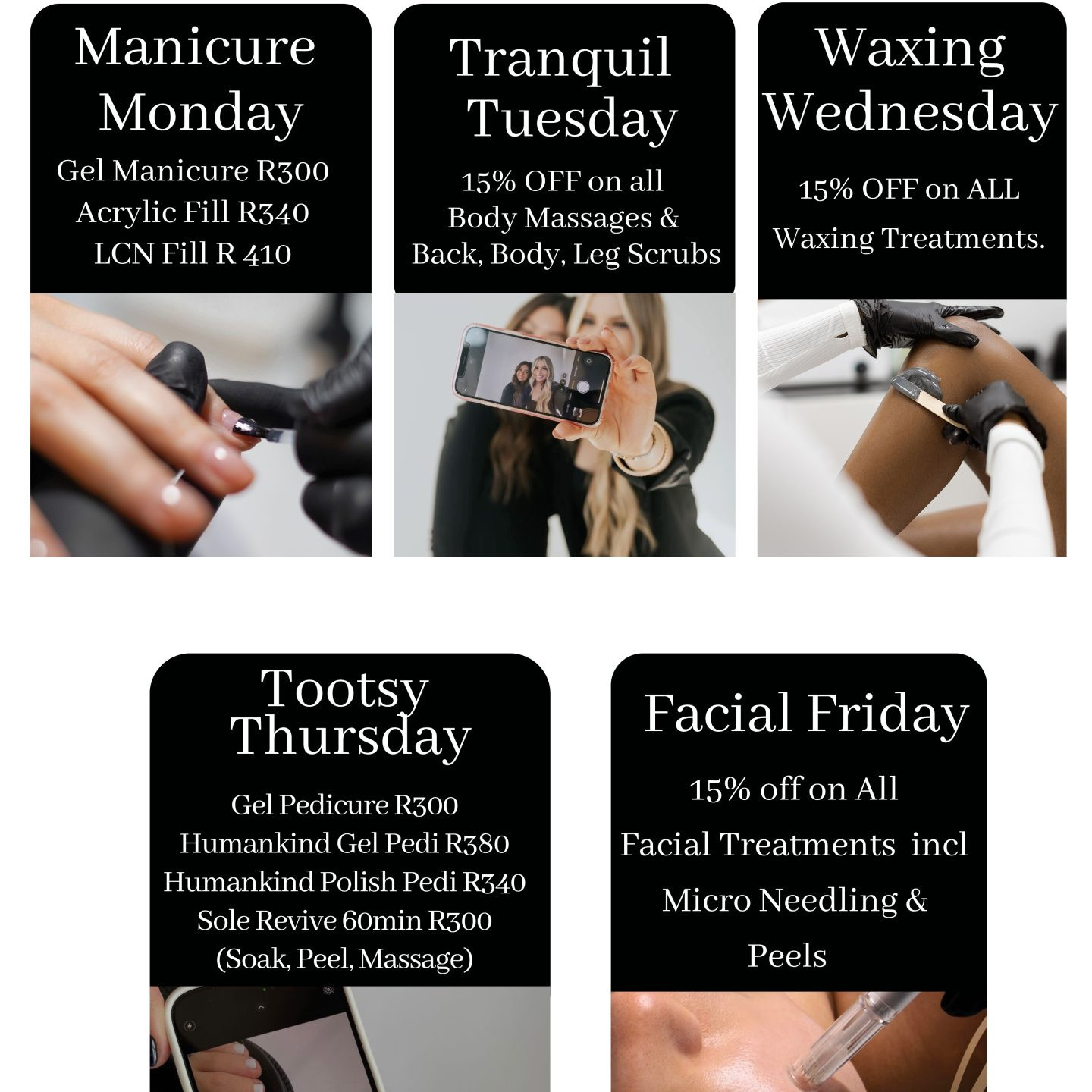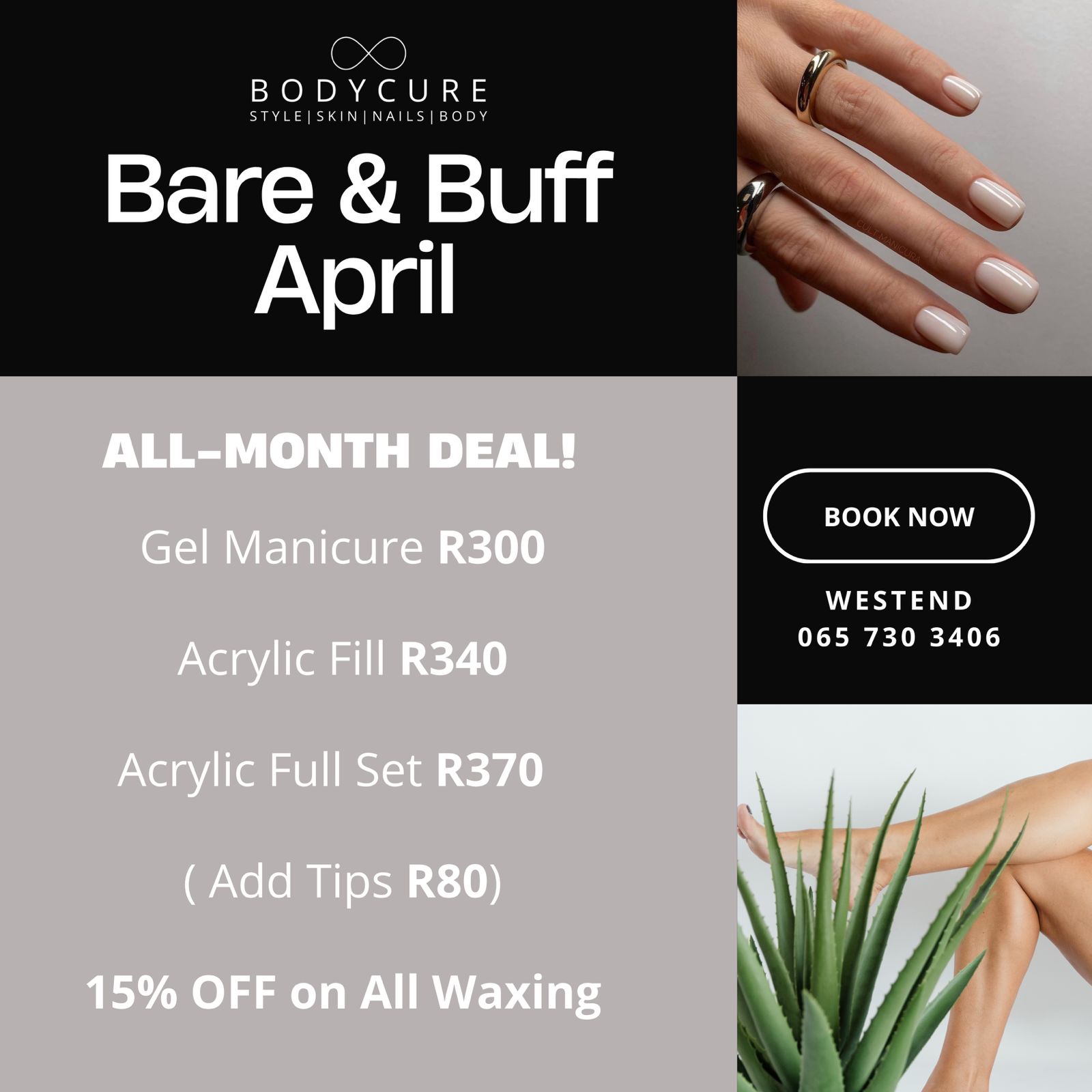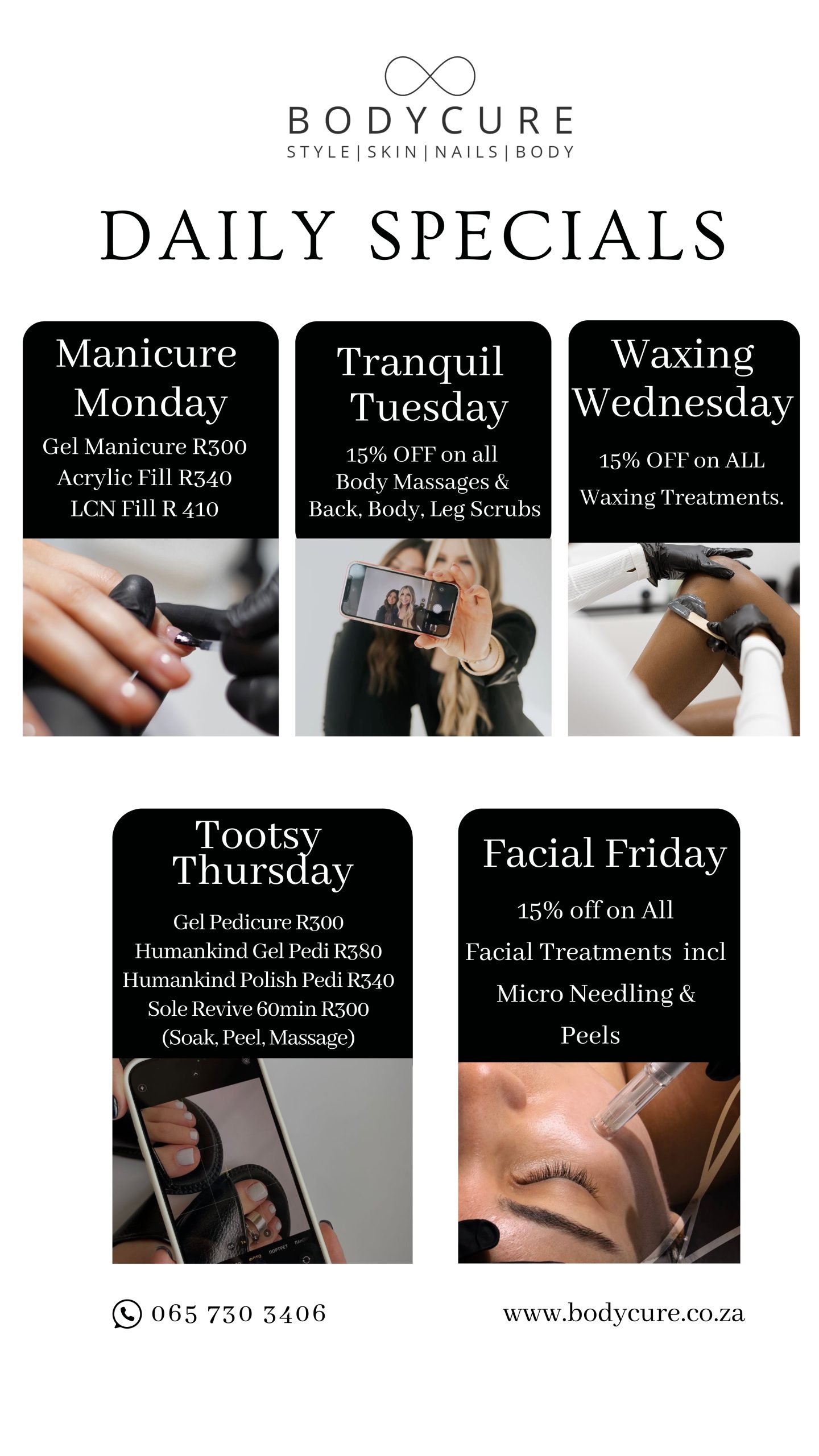 We have daily and weekly tailored specials for the Westend branch, and our 60+seniors can receive 15% off on Mondays & Tuesdays (on our main menu) or enjoy the daily specials as it applies. Join our Bodycure Westend Facebook or Instagram page for more information or request it on our bookings WhatsApp number. We look forward to the visit.